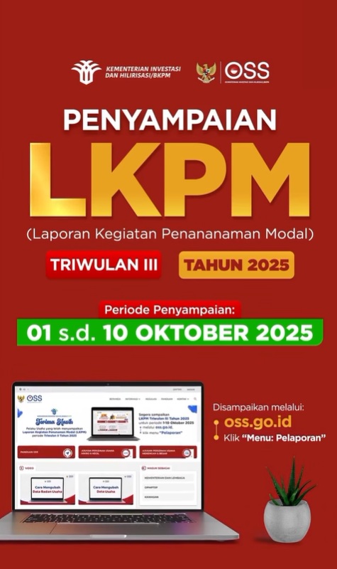 Saatnya kirim LKPM Periode Triwulan III (Juli s.d September) tahun 2025. Pelaporan dibuka mulai tanggal 1-10 Oktober 2025 Melalui laman https://oss.go.id Jangan lupa penyampaian LKPM tepat waktu yaaa... Repost from @oss.go.id Baca Selengkapnya >>