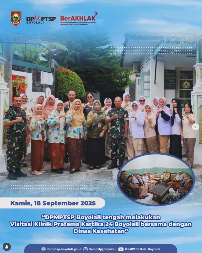 Menindaklanjuti telah dilakukannya upload dokumen persyaratan perpanjangan perizinan Klinik Pratama Kartika 24 Boyolali, bersama ini DPMPTSP telah melakukan Visitasi bersama dengan Dinas Kesehatan Kab. Boyolali dengan metode luring sesuai dengan Kepu Baca Selengkapnya >>