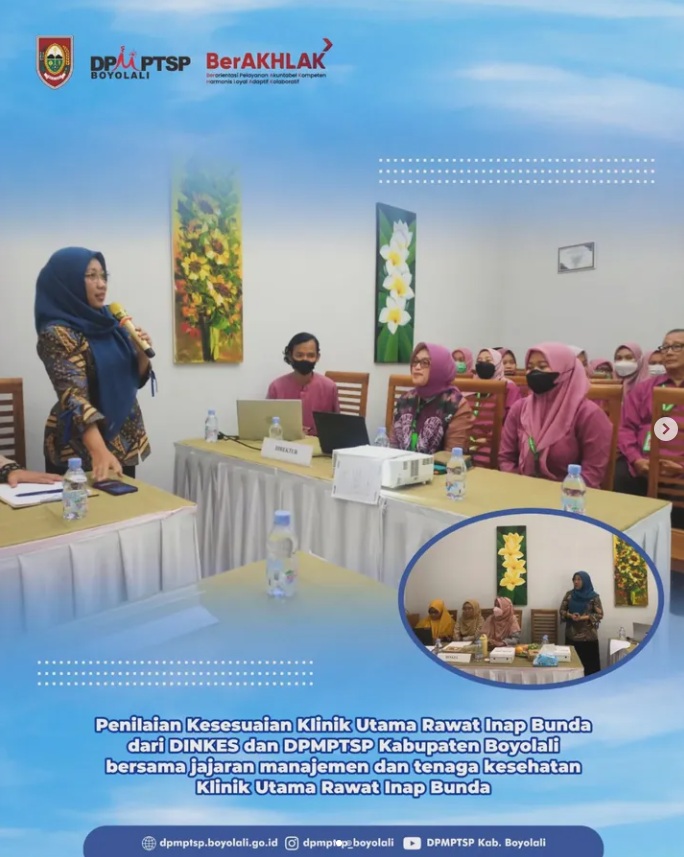Pada hari Kamis (4/09/2025) telah dilaksanakan kegiatan Penilaian Kesesuaian Klinik Utama Rawat Inap Bunda yang berlokasi di Jl. Simo-Kalioso Km-I, Sanggrahan, Pelem, Simo, Boyolali. Kegiatan ini dihadiri oleh tim penilai kesesuaian fasilitas pelaya Baca Selengkapnya >>